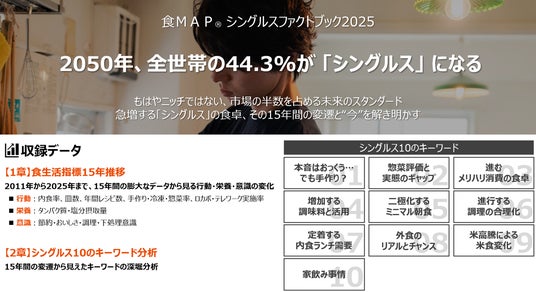 今回リリースする「シングルスファクトブック」には、本記事で触れた内容のほか、単身者の食生活を「ミニマル化する朝食」や「家飲み事情」、「節約志向とおいしさへの投資志向の両立」など、多角的かつユニークな視点から明らかにした分析結果が豊富に掲載されています。