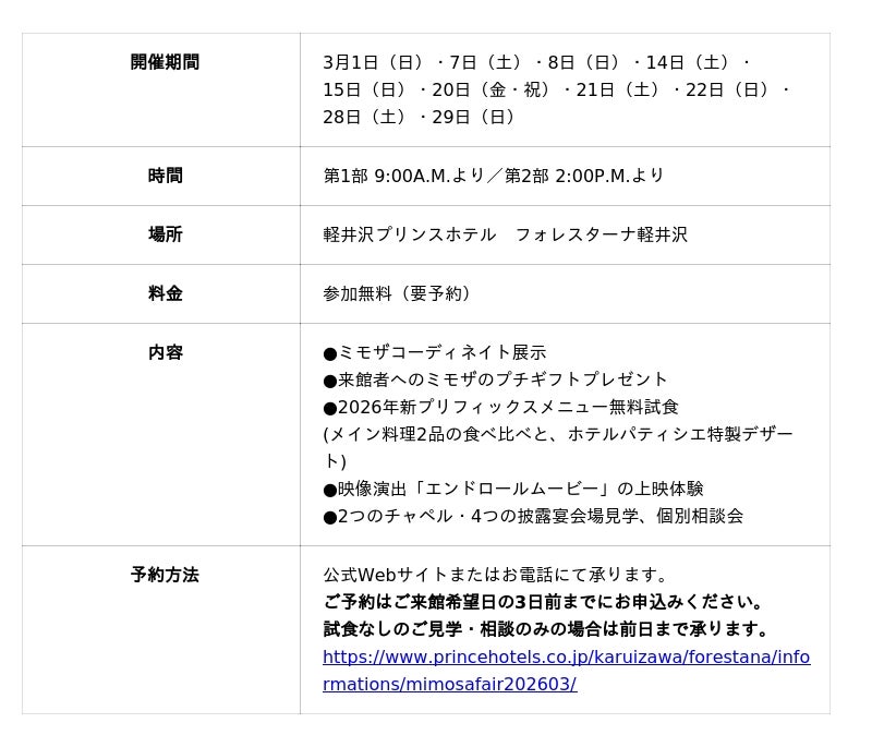 軽井沢プリンスホテル(所在地:長野県北佐久郡軽井沢町 総支配人:影山裕子)の結婚式場「フォレスターナ軽井沢」では、国際女性デーの象徴として親しまれる花「ミモザ」をテーマに、結婚式を検討中のカップルに向けた3月限定のブライダルフェア「ミモザフェア」を2026年3月1日(日)~29日(日)の土休日限定で開催します。