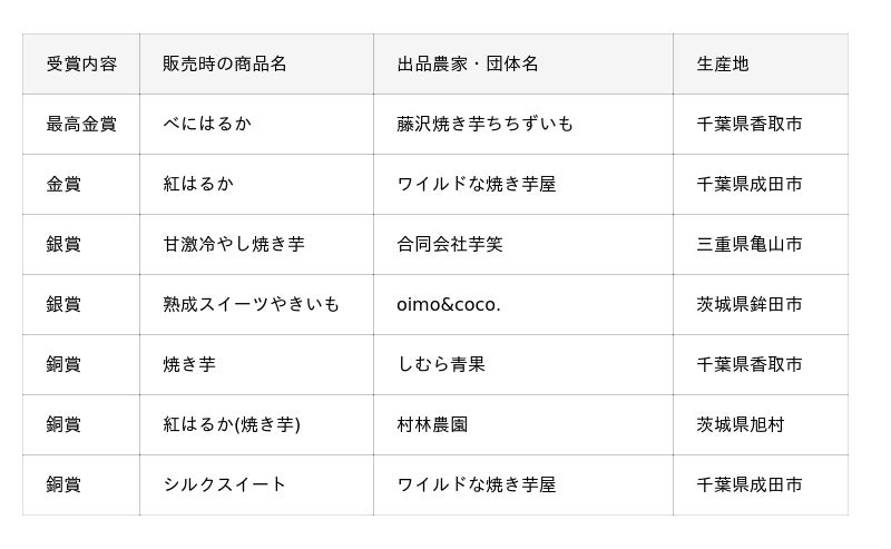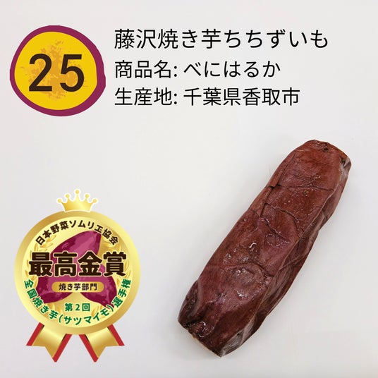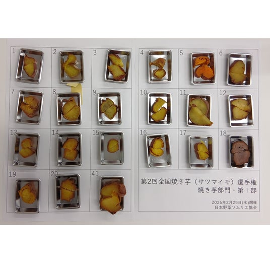 一般社団法人 日本野菜ソムリエ協会(東京都渋谷区、代表理事:福井栄治、以下当協会)は、2026年2月25日(水)に、農産物のさらなる価値向上を目指す青果物の品評会イベントとして「第2回全国焼き芋(サツマイモ)選手権」(以下、本選手権)を2年越しに開催しました。全国から集まったおいしさ自慢のサツマイモ・焼き芋全77品(サツマイモ部門37品・焼き芋部門40品)の中から、評価員である野菜ソムリエが産地や品種、生産者などの情報をすべて伏せて食味。そのおいしさを審査し、もっともおいしい「焼き芋(サツマイモ)」を決定しました。審査の結果、サツマイモ部門は、さつまいも農園 FARM YASHIRO(千葉県香取市)「長期熟成シルクスイート」。焼き芋部門 は、藤沢焼き芋ちちずいも(千葉県香取市)「べにはるか」が日本一に輝きました。
