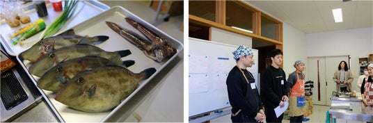 レクチャーの後は、参加者が実際に「イカ割き包丁」を手に取って調理に挑戦しました。- 調理体験:参加者は講師陣にアドバイスを仰ぎながら、カワハギ2匹とイカ1杯を捌きました。2匹目には包丁の扱いに慣れ、手際が良くなる姿も見られました。