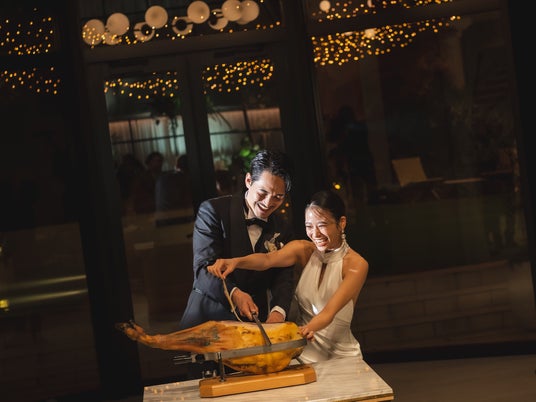 結婚式のプログラムでスペインの旅を表現した最大のポイントは、「生ハム」を取り入れた演出です。結婚式では、初めての共同作業として定番の演出である「ケーキ入刀」にについて、当初おふたりは前向きではなく、もっと自分たちらしい、楽しい演出をしたいと希望されていました。ケーキ入刀の代わりに、番組内での象徴的なシーンを彷彿とさせる演出ができないかと考えたウェディングプランナーは、食べることが大好きなおふたりの旅で何度も登場した「生ハム」への入刀をご提案しました。