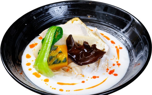 スープは、マレーシアよりもシンガポールのラクサに近いココナッツミルクベース。そこにかぼちゃを加えることで、辛さだけに頼らない、自然な甘みととろみを持たせています。