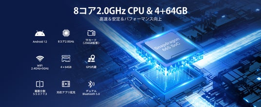 8コア2.0GHz CPU+4GB RAM/64GBストレージに加え、Wi-Fi 2.4GHz/5GHz・Bluetooth 5.0対応で、アプリ起動や切替、接続面も安定性をサポート。
