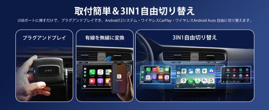 Nerrcilo CarPlay Ai Boxは、車のUSBポートに挿すだけで、車載画面上にAndroid 12を展開し、さらにワイヤレスApple CarPlay/ワイヤレスAndroid Autoもまとめて使える“3 in 1”で、車内導線を整理します。