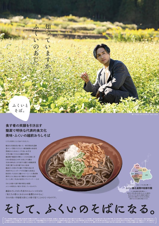 このたび、福井市は、(株)LDH JAPANとの地域活性化連携協定に基づき、ふくい嶺北連携中枢都市圏の特産物『在来種そば』のPRとして、福井市食のPR大使橘ケンチ氏(EXILE/EXILE THE SECOND)が登場する新ビジュアルの『ふくいとそば。The Poster』第3弾を制作しました。