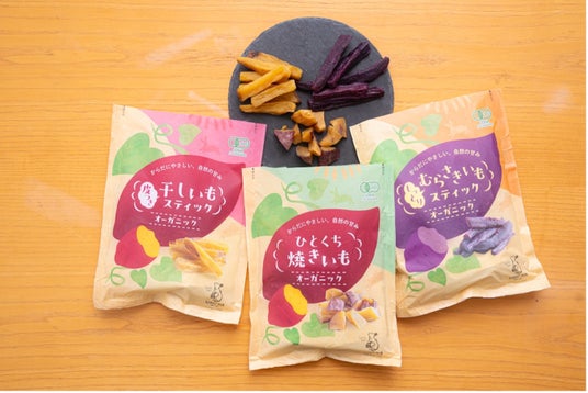 オーガニックのお芋は、お芋の素材を活かした素朴な味わいが特徴のおやつです。商品は「有機ひとくち焼きいも」、「有機皮つき干しいもスティック」、「有機しっとり紫いもスティック」の3種展開で、一度に食べ切れるサイズの小袋が2袋入っております。