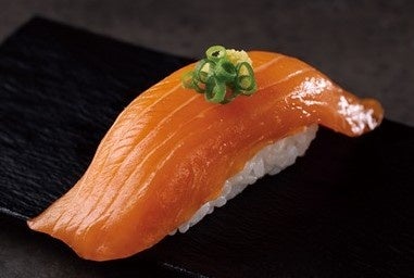 1.づけサーモン:特製だれに漬け込み、醤油の香りと旨味をじっくり染み込ませました。噛むほどに広がる「わさび」の風味と「ネギ」の食感がアクセントになり、奥行きのある1貫です。