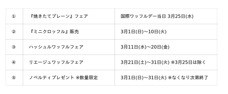 なお、《国際ワッフルデー》当日の3月25日(水)には丸い形のリエージュワッフルを焼きたてで提供する『焼きたてプレーン』をキャンペーン価格で販売いたします。