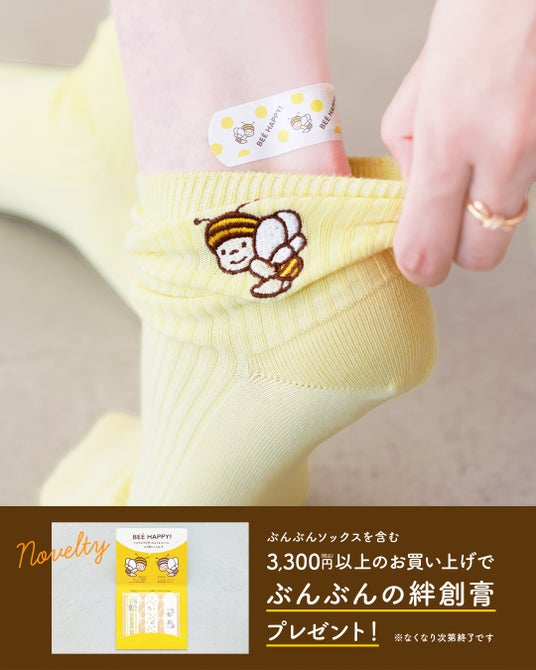 「靴下屋」店舗にてノベルティプレゼント「靴下屋」各店舗にて、「長坂養蜂場」×「靴下屋」コラボソックスを含む3,300円(税込)以上のお買い物をした方に、長坂養蜂場の商品「ぶんぶんの絆創膏」をプレゼント!