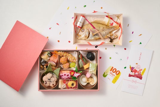 祝い膳のお料理は、明治21年創業でおせち料理や駅弁のパイオニアとして知られる老舗「まねき食品」が担当。長年培われた技と昔ながらの製法を活かし、お食い初めにふさわしい祝い膳として丁寧に仕上げています。「生涯食べるものに困りませんように」という願いに、「おいしいものを選ぶ力を、最初の体験から育んでほしい」という想いを込めています。