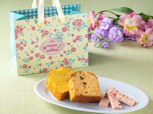 内容:春限定デザインのプティバッグ型パッケージ。洋酒がアクセントの「ミニパウンドケーキ(オレンジ・フルーツ)」と「苺クランチチョコ」を楽しめる、贈り物にぴったりなセットです。