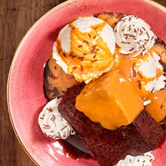 「ドルチェ・デ・レチェ ブラウニー」スペインやラテンアメリカが起源の「ドルチェ・デ・レチェ」にチョコレートソース、アイスクリーム、ホイップクリームをトッピングしたブラウニー。