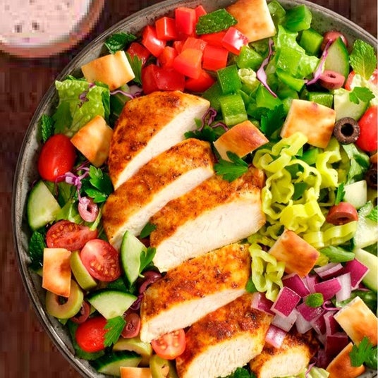 ロメインレタス、キュウリ、ブラックオリーブ、トマト、パプリカなどをレッドワインシーザードレッシングで和え、ケイジャンチキンをトッピング