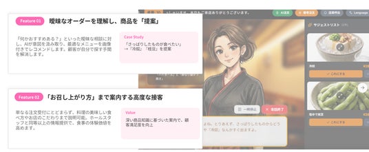 本プロダクトは、単なる音声機能の追加にとどまらず、相談・提案・共感・注文確定までを一連の接客プロセスとして捉え、操作中心の注文体験を対話を軸とした意思決定支援の体験へと進化させることで、飲食店におけるAI活用の具体像を提示します。