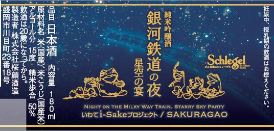 宮沢賢治作品からインスピレーションを受けた作品「ゴム長靴のシュレーゲル」の認知度向上、そして同じく宮沢賢治作品をモチーフとした商品を販売する桜顔酒造の「純米吟醸 銀河鉄道の夜」を組合せ、若者に日本酒をより身近に感じてもらうことも目的とした、岩手大学生と地域企業の産学連携から生まれたコラボレーション商品です。
