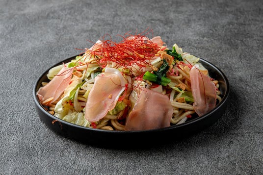 生ハムと春野菜のレモンソルト焼そば菜の花のほろ苦さと竹の子の食感を、レモンソルトの酸味で爽やかに仕上げた焼そばです。生ハムの塩気とガーリックチップの香ばしさがアクセント。お酒の席でのシェアにも最適な、大人の味わいです。販売価格1,630円~。(税込)