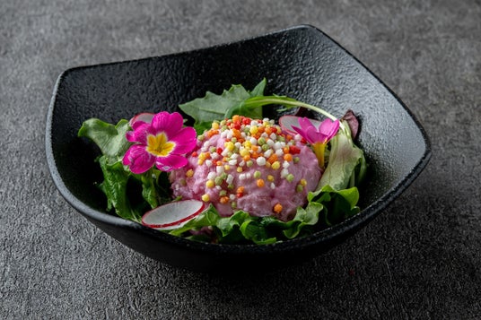 ビーツとキャベツの春色ポテトサラダビーツを使用し、春らしいピンク色に仕立てたポテトサラダです。キャベツの食感と、トッピングされた五色あられの彩りが目を楽しませます。前菜として「まず一品」におすすめしたい、春爛漫のサラダです。販売価格530円~。(税込)