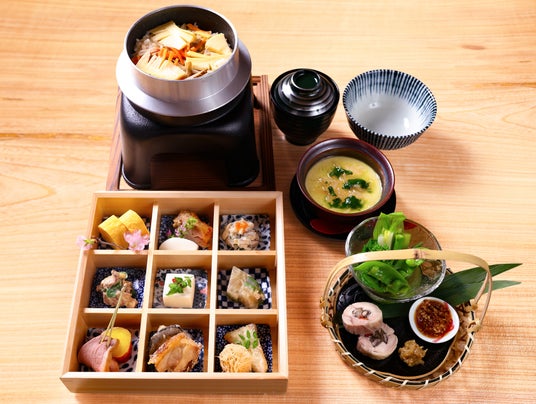 九つの仕切りに、京赤地鶏と京鴨の料理を中心に、春野菜や山菜を彩り豊かに盛り込み、目でも舌でも春を感じていただける一膳です。
