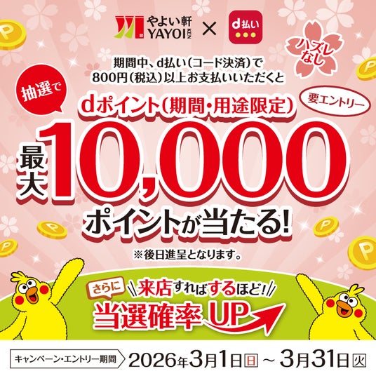 このたび日本国内の「やよい軒」では、d払いをご利用でお得にdポイント(期間・用途限定)をゲットできる『d払い利用でやよい軒にて最大10,000ポイントがあたる!キャンペーン』を実施いたします。