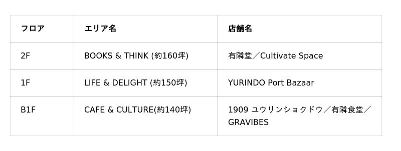 - 営業時間:10:00~21:00(1F・2F)、11:00~21:00(B1F「有隣食堂」「GRAVIBES」)、11:00~22:30(B1F「1909 ユウリンショクドウ」)※日曜日は11:00~21:00
