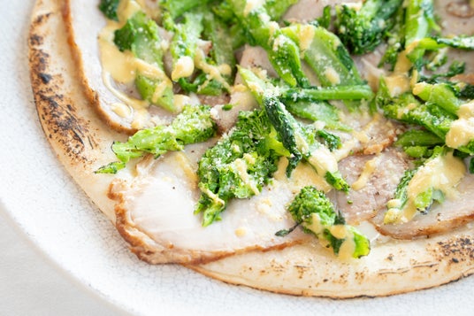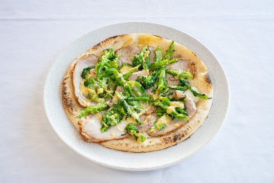 ロースハムと菜の花のクリームピザ マスタード風味 2,000円(税込)緑と黄色が映える、春カラーのクリームピザ。