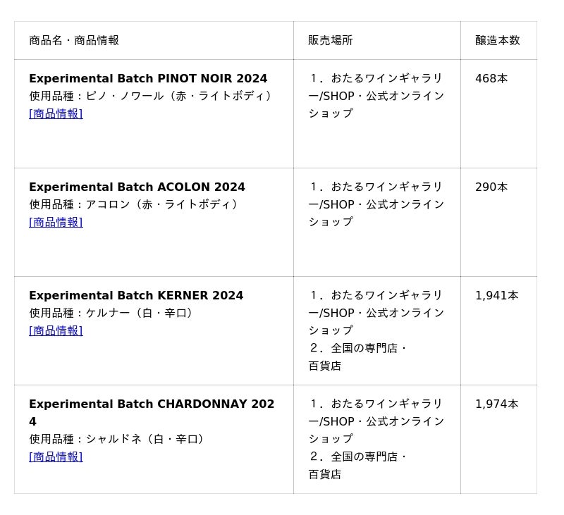 受賞商品である「Experimental Batch」シリーズ最新ヴィンテージ「2024」を以下の通り販売いたします。直営店舗「おたるワインギャラリー/SHOP」および公式オンラインショップでは、全国販売に先駆け、3月2日(月)より全4銘柄を展開いたします。
