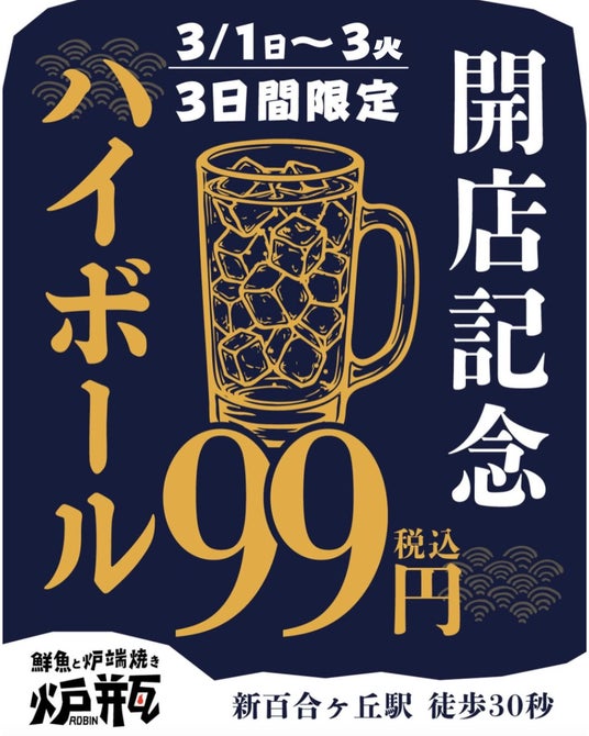株式会社Mostfun(本社:神奈川県横浜市/代表取締役:大崎拓実)は、2026年3月1日、神奈川県川崎市・新百合ヶ丘駅徒歩1分に新店舗「鮮魚と炉端焼き 炉瓶(ロビン)」 をグランドオープンします。オープン記念として、3月1日から3月3日の3日間で、ハイボールを特別価格の99円で提供するキャンペーンを実施します。