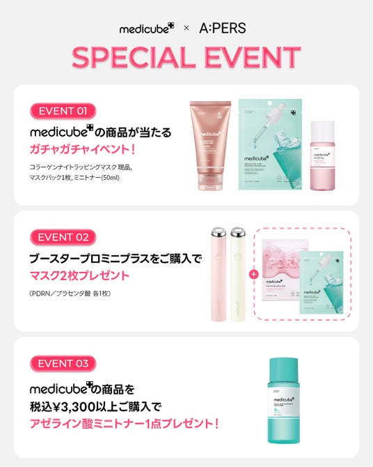 韓国発のダーマコスメブランド「medicube(メディキューブ)」は、体験型ライフスタイルセレクトショップ「A:PERS(エイパース)」にて、2026年2月28日(土)~3月22日(日)よりPOP-UPイベントを開催いたします。