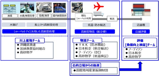 沖縄県国頭漁業協同組合、株式会社フーディソン、高砂熱学工業株式会社、日本航空株式会社、YKK株式会社、沖縄県漁業協同組合連合会、公益財団法人函館地域産業振興財団(北海道立工業技術センター)は、国頭漁協で獲れた鮮魚を、独自の冷却技術と新梱包材を活用した航空輸送を組み合わせ、魚の鮮度を科学的に評価する「K値」の考えに基づきお届けする「高鮮度輸送プロジェクト」(以下「本プロジェクト」)を始動します。