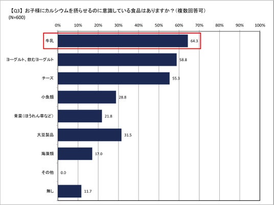 そして、子どもにカルシウムを摂らせるのに意識している食品の第1位は牛乳で、全体の6割以上の母親が意識していることがわかりました。
