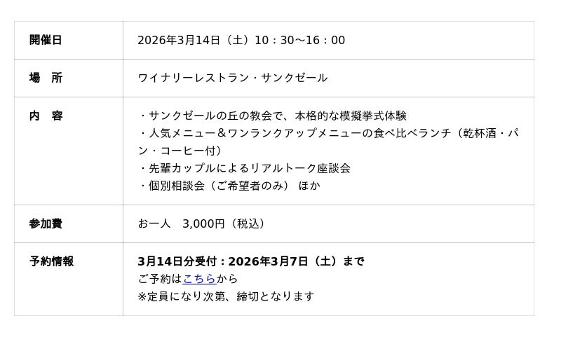 「久世福商店」、「St.Cousair(サンクゼール)」などの専門店を全国に約 180 店舗展開している、食品製造小売企業(食品 SPA)の株式会社サンクゼール(本社:長野県飯綱町/代表取締役社長:久世良太)は、2026年3月、結婚式に関するさまざまなシーンを体験できるブライダルフェアを開催いたします。