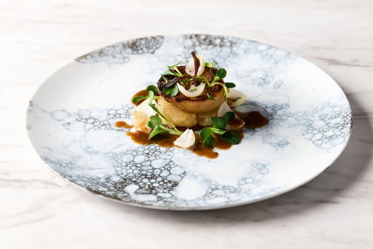 「玉ねぎの五技法タルト」ピュレ、ロースト、発酵、ボイル、高温スチーム──玉葱の甘みや香り、食感をさまざまな技法で重ね、素材が持つ旨みを引き出した春のタルトです。香ばしく焼き上げた生地に添えた発酵玉ねぎは、ドイツの伝統的な発酵食・ザワークラウトの発想を生かし、野菜の力をそのまま引き出した自家製の一品。乳製品を使わずに仕上げたやわらかくクリーミーな風合いは、発酵がもたらす奥深さを感じさせる、印象深い味わいです。