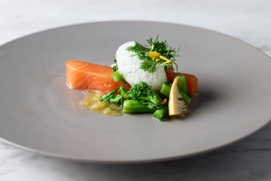 春のテーブルには、若草色のエスプーマを中心に彩り豊かな葉や山菜を輪のように配したアミューズ、ベビーリーフの冠をまとい、ほのかな黄金色のグラデーションが層を織りなす玉ねぎのタルト、そして艶やかな紅色のニジマスに春の食材を添え、軽やかな発酵レモンの風味を感じる一皿など、フレンチの技法に、長い歴史が育んだ発酵文化の知恵を重ねた料理が並びます。