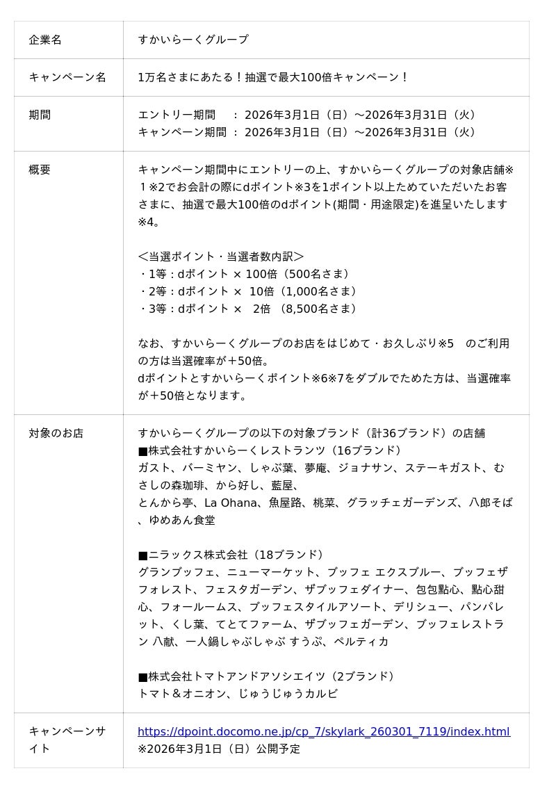 本キャンペーンへの参加にはエントリーが必要で、キャンペーンサイトからエントリーの上、すかいらーくグループの対象店舗※1※2でお会計の際に、dポイント※3を1ポイント以上ためたお客さまに、抽選で最大100倍のdポイント(期間・用途限定)を進呈いたします※4。 詳細はキャンペーンサイトにてご確認ください。