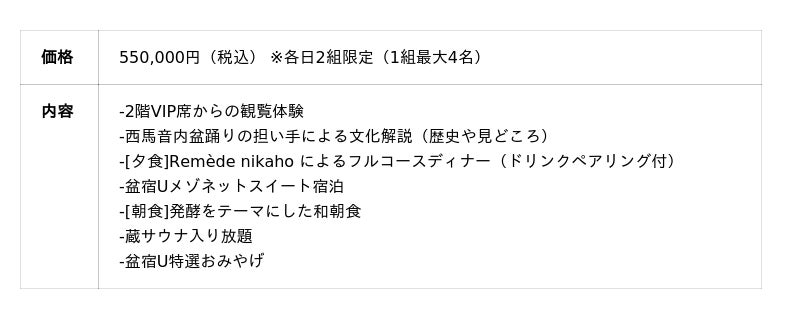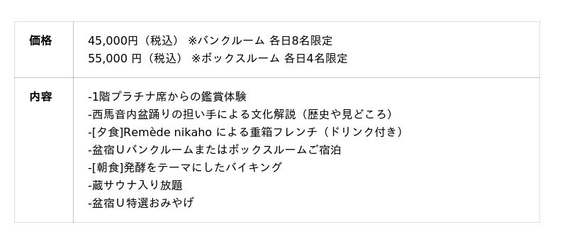 2年目となる今年は、西馬音内盆通りを中心とする地域の文化をより深く体感いただくことのできる2つのプランをご用意しました。混雑を気にすることなく母屋2階のお座敷から会場を俯瞰するように鑑賞できる「VIPプラン」と、奥行きのある空間を活かし1階の土間で視点を自由に変えながら鑑賞できる「プラチナプラン」。どちらも、料理・飲み物と宿泊がセットになっており、1年に3日間しかない西馬音内盆踊りを、盆踊り会場の中心に位置する当施設にゆっくりと滞在しながら贅沢に体感していただけます。従来の「観覧」体験に留まらない、盆宿Uでの滞在を通じて西馬音内盆踊りを五感で体感する唯一無?の「鑑賞」体験を。