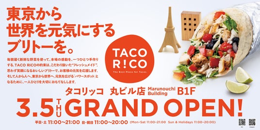 ハピタ株式会社(本社:東京都港区、代表取締役:北島 昇)は、2026年3月5日(木)、東京・丸の内エリアのランドマーク「丸ビル」B1Fに、メキシカン・ファストカジュアル「TACO RiCO(タコリッコ)」をグランドオープンいたします。 創業から10年を経てたどり着いた「丸の内」という舞台。 効率化が進む都心において、あえて手間暇かけた「完全手作り」のスタイルを貫くことで、丸の内を 行き交う多忙なビジネスパーソンや、日本中そして世界中から訪れる観光客の皆様へ「おいしさ」と「元気」を提供します。