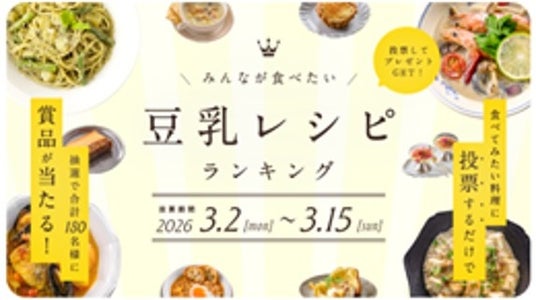 「豆乳で楽しむ世界の料理」サイトの公開にあわせ、「みんなが食べたい豆乳レシピランキングキャンペーン」を企画いたしました。「豆乳で楽しむ世界の料理」に掲載されている全48レシピの中から「1番食べてみたい!」と思うレシピを選んで投票いただくと、人気レシピの試食会へのご招待またはレシピブック&豆乳が抽選で合計180名様に当たります。また、投票結果は2026年4月中旬に公式ホームページで発表いたします。