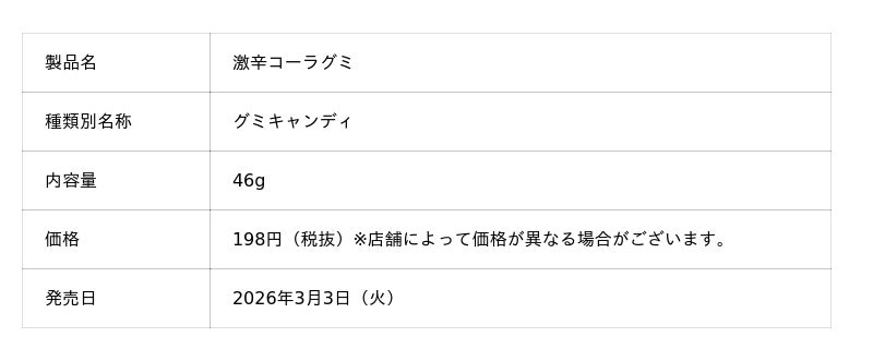 『激辛コーラグミ』は、“激辛チャレンジ”や“リアクション系体験動画”でZ世代から絶大な支持を集める人気インフルエンサーのパンナコタが監修した、とうがらしをイメージした真っ赤なビジュアルと刺激的な辛さが特長の激辛グミです。コーラ味をベースにした甘辛いバランスがクセになる味わいで、動画やSNSで投稿したくなる体験型の“食べたら叫ぶ”リアクション必至の激辛設計です。