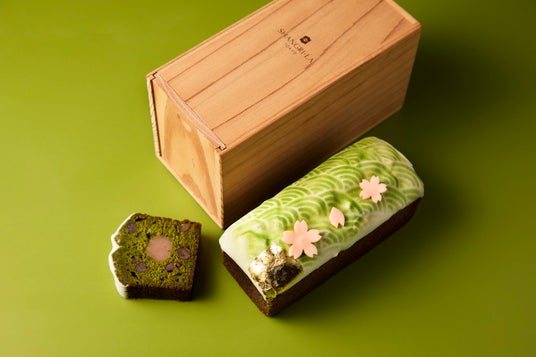 焼き菓子には、季節の風味を閉じ込めた「プレミアム抹茶桜パウンドケーキ」が登場します。香り豊かな抹茶生地に大粒の大納言小豆を合わせ、中心には桜餡を包み込み、しっとりと焼き上げました。表面を包むホワイトチョコレートには青海波を施し、桜のチョコレートと金箔を添えて上品に仕立てました。ご自身へのご褒美や、大切な方への贈り物としてもお選びいただけます。