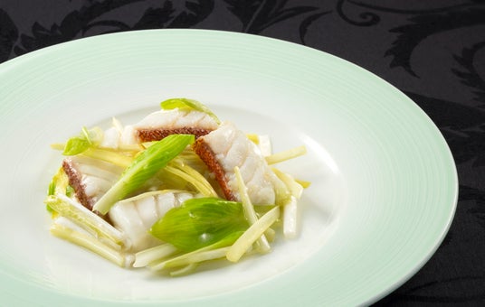 この上質なすじあらを、広東料理ならではの強い火力で一気に炒め上げる技法を用い、春野菜のうるいと黄ニラとともに塩味を基調に仕上げました。短時間で仕上げることで、魚の旨みを閉じ込めながら、野菜の瑞々しさと香りを際立たせています。