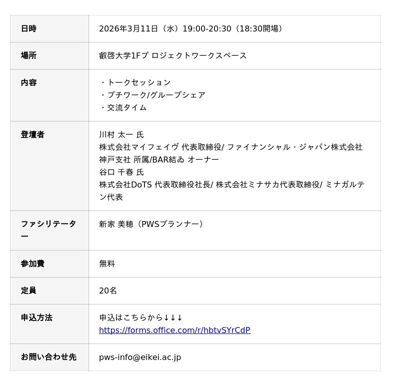 叡啓大学(学長 有信睦弘、広島市中区)は、3月11日(水)、叡啓大学のプロジェクトワークスペースにて、PWS月次イベント:想いを分かち合う場を耕し、「人を繋ぐ」を仕事にする、新しいキャリアの形を開催いたします。