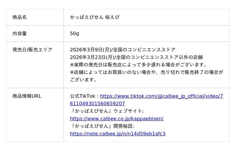 カルビー株式会社(本社:東京都千代田区、代表取締役社長兼CEO: 江原 信)は、“やめられない、とまらない♪”でおなじみの「かっぱえびせん」から、桜えびを100%使用※し、春の訪れを感じさせる新商品『かっぱえびせん 桜えび』を2026年3月9日(月)より全国のコンビニエンスストア先行で期間限定発売します。コンビニエンスストア以外の店舗では、2026年3月23日(月)より期間限定発売します(2026年6月上旬終売予定)。※桜えび、乾燥桜えびとして