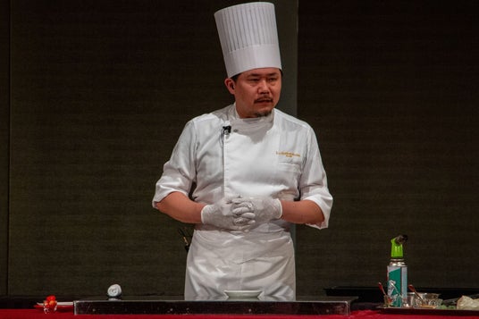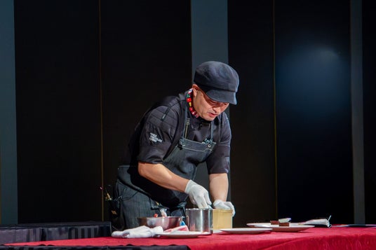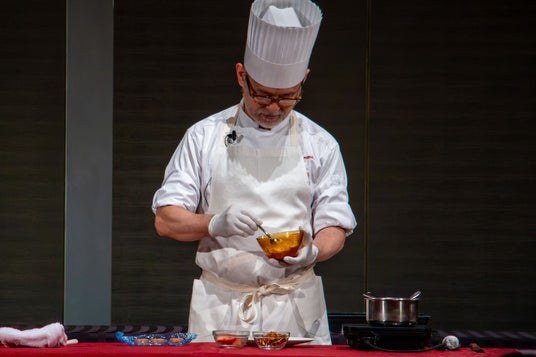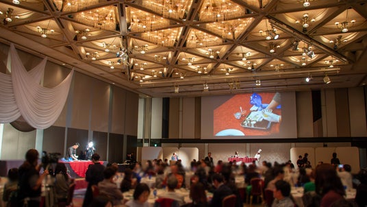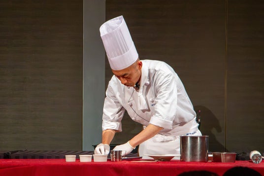 会場には円卓を配し、テーマである“いちご”を想わせる赤いテーブルクロスで統一。華やかな雰囲気の中で開催しました。会場内に設けたキッチンステージでは、9名のシェフが順に登場し、一皿ごとに解説を交えながら仕上げを行い、さらにシェフの手元を会場中央のスクリーンに映すと同時に、お客さまに同じスイーツを提供。温かいスイーツは温かいうちに、冷たいスイーツは冷たいうちに召しあがっていただけるよう、出来立ての状態をお届けしました。