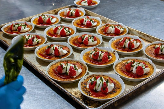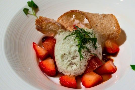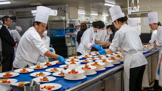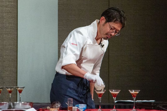 本イベントは、2026年5月6日(水・振休)まで開催中の『SOCOスイーツブッフェ~ストロベリー・ピクニック~』のスピンオフイベントとして、ホテルの大宴会場「大輪田」にて実施。神戸のパティシエ・プロジェクト「オリジンコウベ」のパティスリーシェフ8名と、ポートピアホテル製菓料理長・芳養が一堂に会し、“いちご”をテーマにアシェットデセール(皿盛りスイーツ)をコース仕立てでお届けする、一日限りの特別企画です。会場内にはキッチンステージを設け、シェフ自らが解説を交えながら一皿を仕上げる様子を披露。また、会場中央のスクリーンにもシェフの手元の映像を映し出し、臨場感とともにスイーツをお愉しみいただきました。