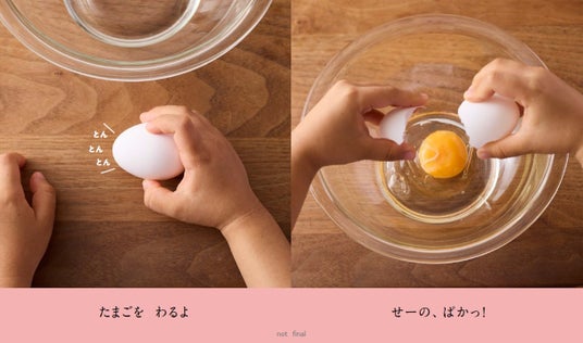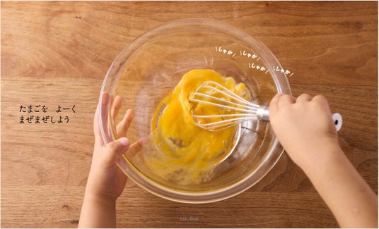 わって、そそいで、まぜて、やいて、