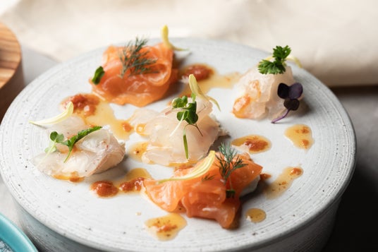 2種鮮魚のカルパッチョ レモンバーム香るサルサソース 1,391(1,530)季節の鮮魚を、自家製豆腐マヨとエスニックなソースで仕上げました。