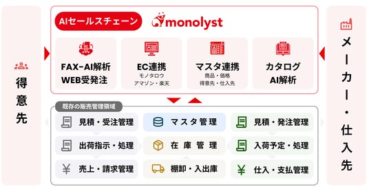2025年4月より製造業向けAIセールスプラットフォーム 「monolyst(モノリスト)」の提供を開始。本システムは、紙カタログからスペックや商品画像の取得・管理を行う商品情報管理システムを中心として、FAX AI解析、Web受注システム、市場価格調査、EC連携、売上分析などマルチプロダクトを展開。機械工具、建材、自動車・バイク部品の卸やメーカーへの導入が続々と進む。
