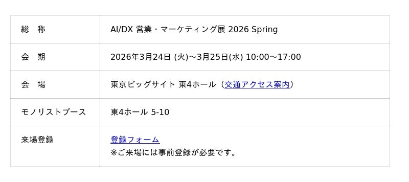 製造業向けAIセールスプラットフォーム 「monolyst(モノリスト)」を提供するmonolyst株式会社(本社:東京都渋谷区、代表取締役:伊関 洋介、以下「当社」)は、2026年3月24日(火)~3月25日(水)に東京ビッグサイトでイプロス社が初開催するリアル展示会「AI/DX 営業・マーケティング展 2026 Spring」に出展します。