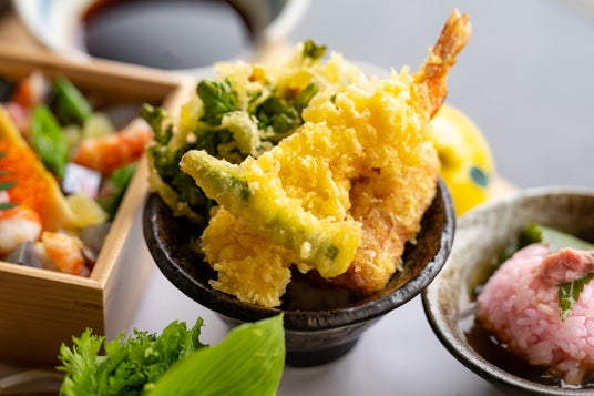 健康長寿と立身出世を願う、海老と山菜の天結び丼。