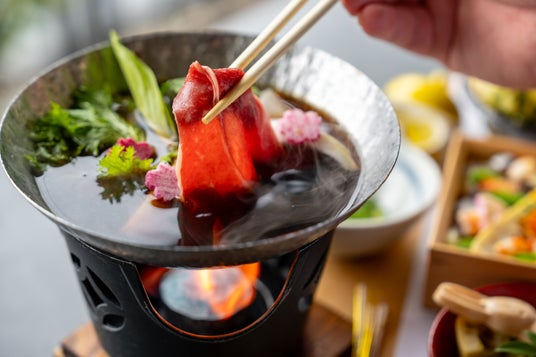 一品目は「春の野山と海の幸 花見鍋」をご用意しました。桃色の霙(みぞれ)を春霞に、抜き型で満開の桜に見立てた、目でも春を感じるお鍋です。桜鯛をはじめ、開運食材をふんだんに使用しております。お好みでポン酢とともにお召し上がりください。